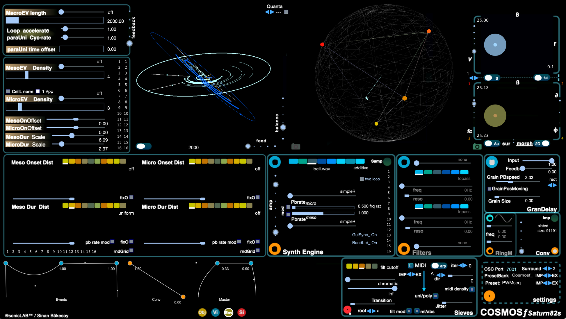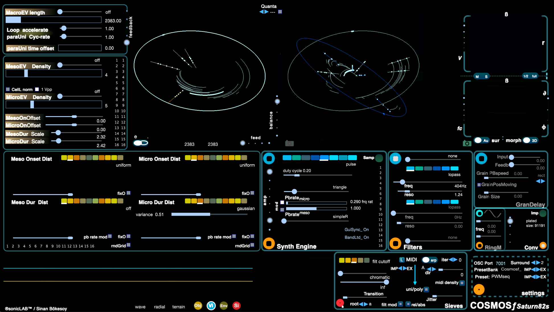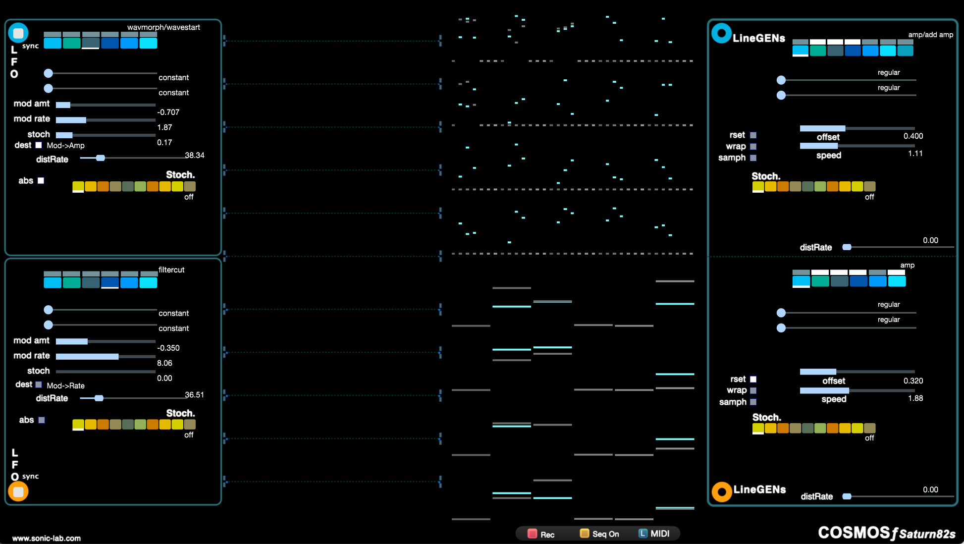 Cosmosf FX offers sophisticated delay buffer handling and sampling features of live audio with a stochastic event generation system. It can process the live audio input in various ways, offering the expected richness of the Cosmosf multiple time scale event generation.