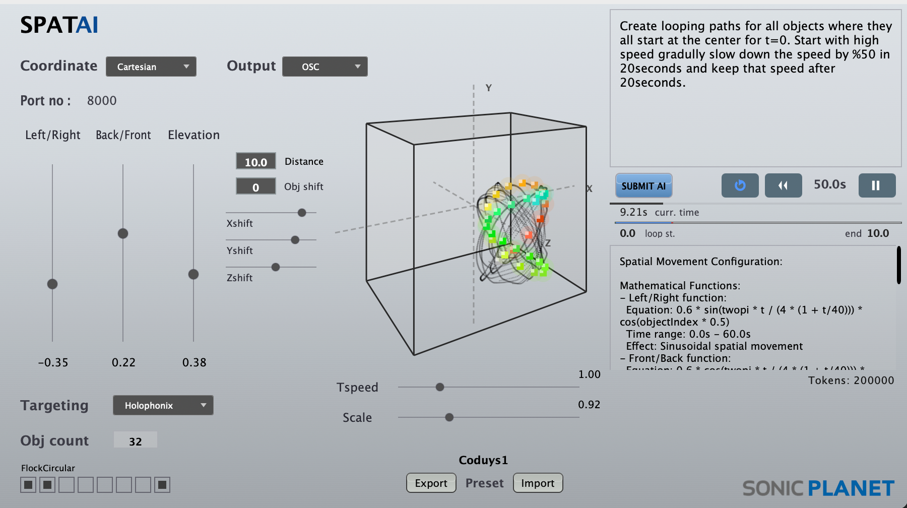 SPATAI is a utility software that offers Large Language Model AI assistance to move sound objects in a virtual 3D acoustic space. It translates in real time the movement of multiple objects in cartesian or polar coordinates and sends this movement data to other 3D audio spatialization software.